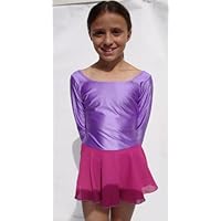 Beautiful ice skating dress in Lavender top with scoop neck; 3/4 length sleeves; Fuchsia chiffon skirt with Lavender trim